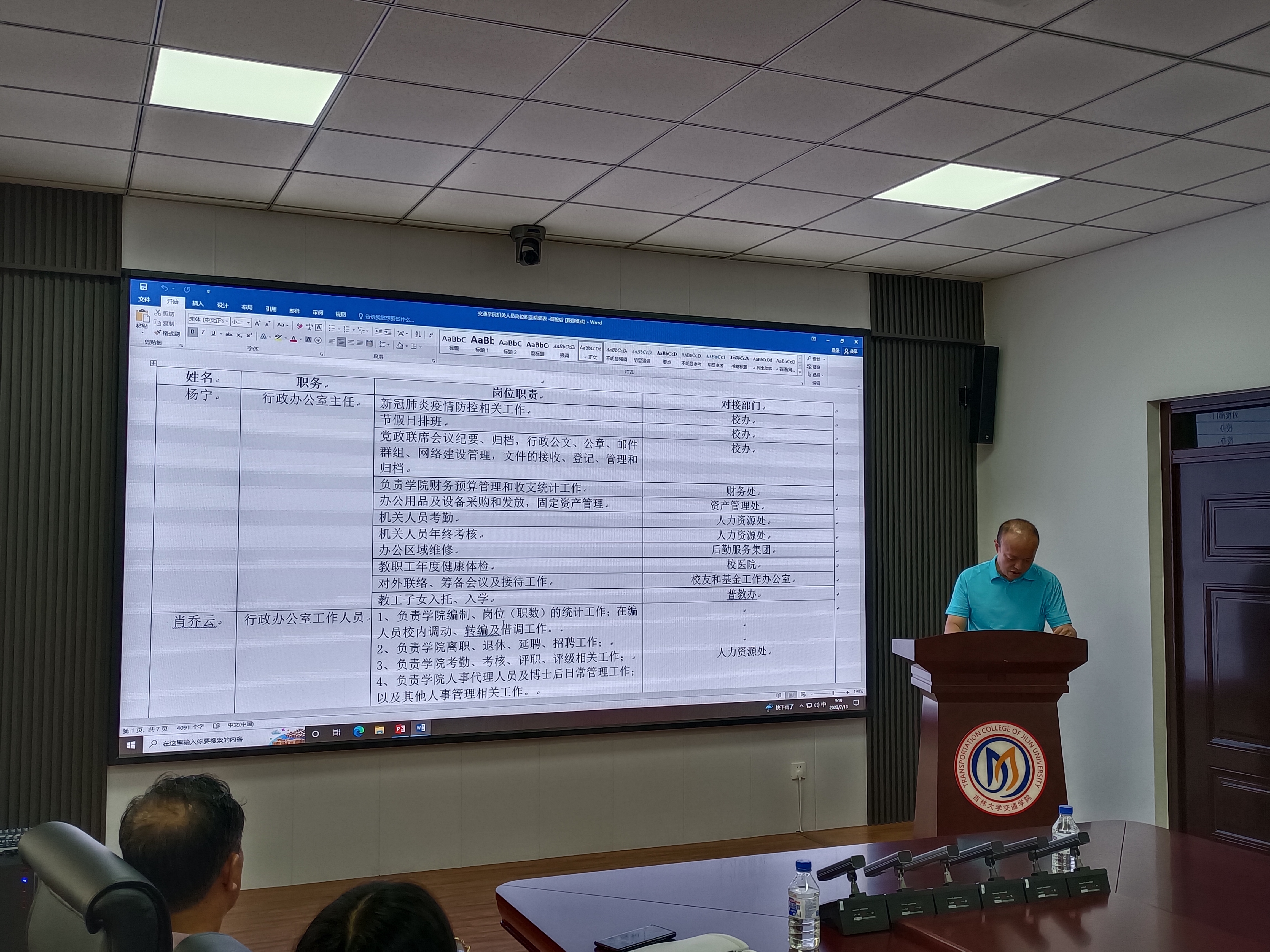 根据工作需要,学院党政联席会研究决定,对学院机关人员岗位职责进行了调整。会上,行政副院长吕昆公布了学院机关人员岗位职责调整情况和办公室调整方案,并要求学院机关人员以崭新的精神风貌和积极的工作作风迎接新学期的各项工作。