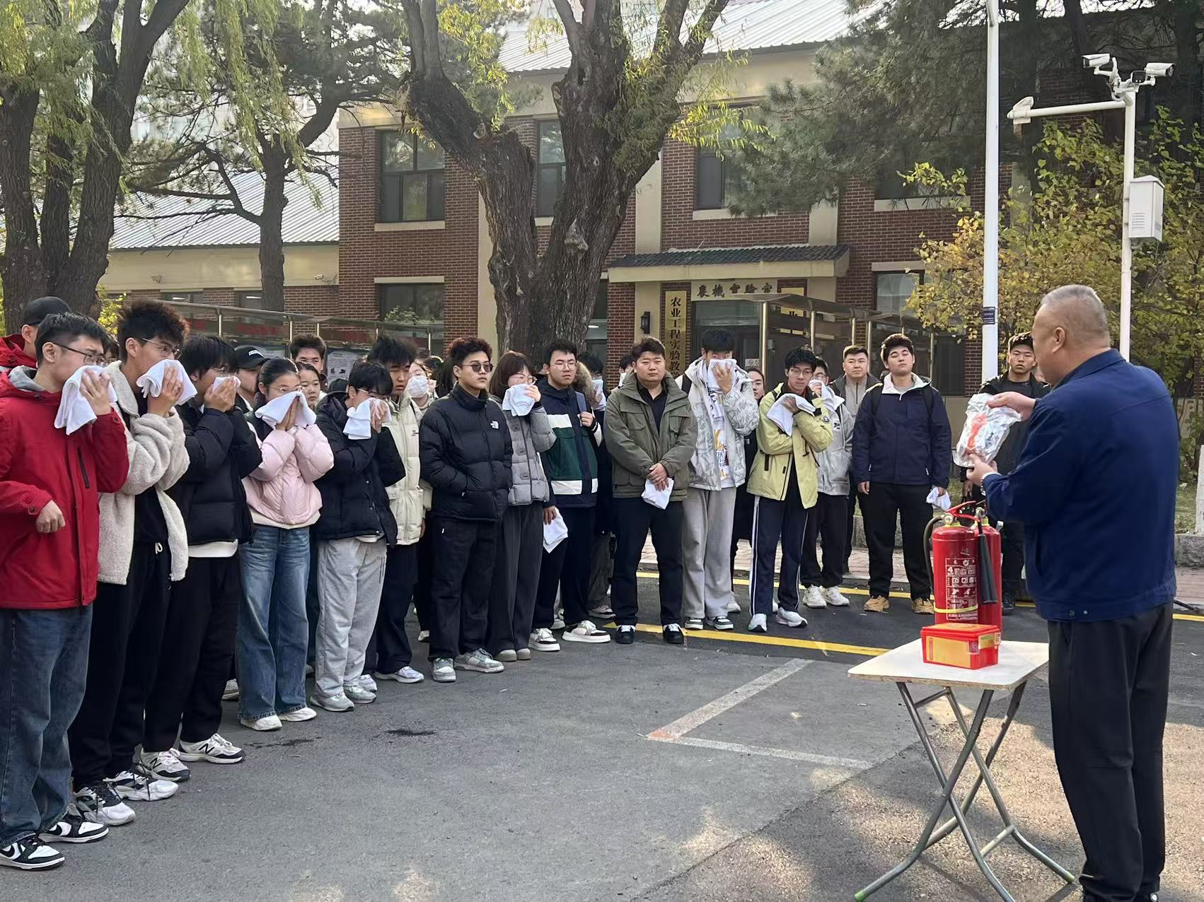 疏散集结完毕后,王中刚科长在现场继续讲解了灭火器的“提、拔、握、压”使用口诀及操作要领。在保卫科工作人员的全程监护下,师生们踊跃参与了灭火器使用的实操训练,亲身体验了初期火灾的扑救过程。