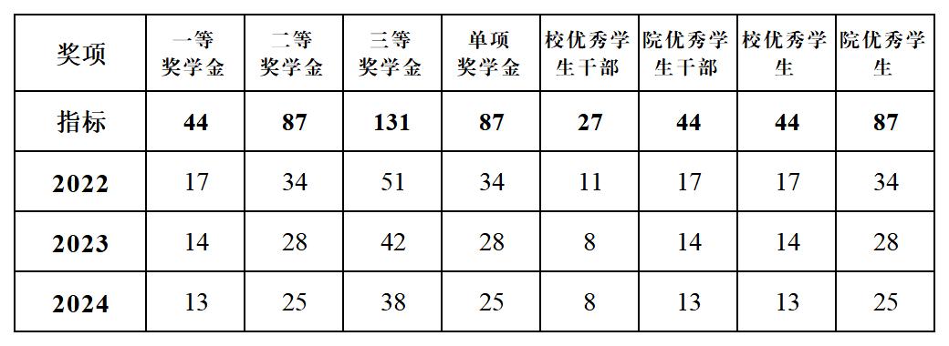 根据党委学生工作部《关于开展2024-2025学年奖学金、优秀学生和优秀学生干部评选工作的通知》相关要求,黄色网址 学生奖助工作领导小组根据学校下达的学年奖学金、优秀学生和优秀学生干部评选指标,按年级或专业进行分配。结合学院各年级实际情况,现将黄色网址 2024-2025学年奖学金、优秀学生和优秀学生干部评选工作各年级评选指标公布如下: